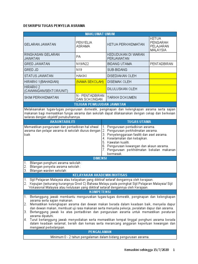 Bidang Tugas Penyelia Asrama N17 from imgv2-1-f.scribdassets.com Diharapkan dengan perkongsian senarai tugas penolong pegawai pembangunan masyarakat s29 dapat membantu anda dalam persediaan temuduga spa nanti. Kelengkapan asrama serta sajian makanan. Saranan kkm semasa prn sabah. Membantu merancang, memantau dan mengemaskini mengemaskin i senarai nama dan kedudukan. Menerima senarai penempatan murid baru daripada pengetua/pk hem. Fungsi bidang tugas bagi penyelia asrama gred n17 adalah seperti berikut: Menyemak dan menyelenggara panjar wang runcit. Cari, senarai pendek dan bandingkan ribuan kursus untuk mencari yang terbaik.